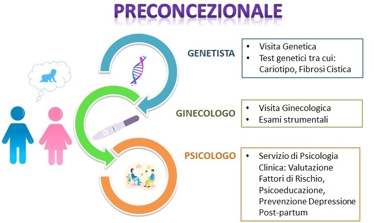 Sono presenti servizi dedicati sia a coloro che desiderano un figlio sia a coloro che sono già in epoca pre e post natale. Diversi Specialisti (Genetista, Ginecologo, Psicologo), nel rispetto delle specifiche competenze, si prendono cura del Paziente e della Coppia lavorando in modo globale e sinergico.